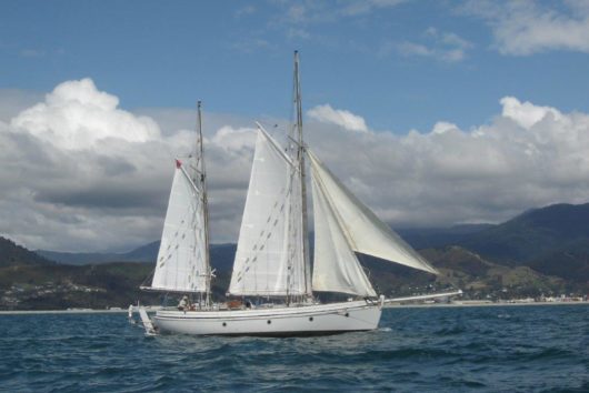 Her masts are Corten ‘A’ galvanized steel, Gaffs, booms and bow sprit are all in galvanized steel.